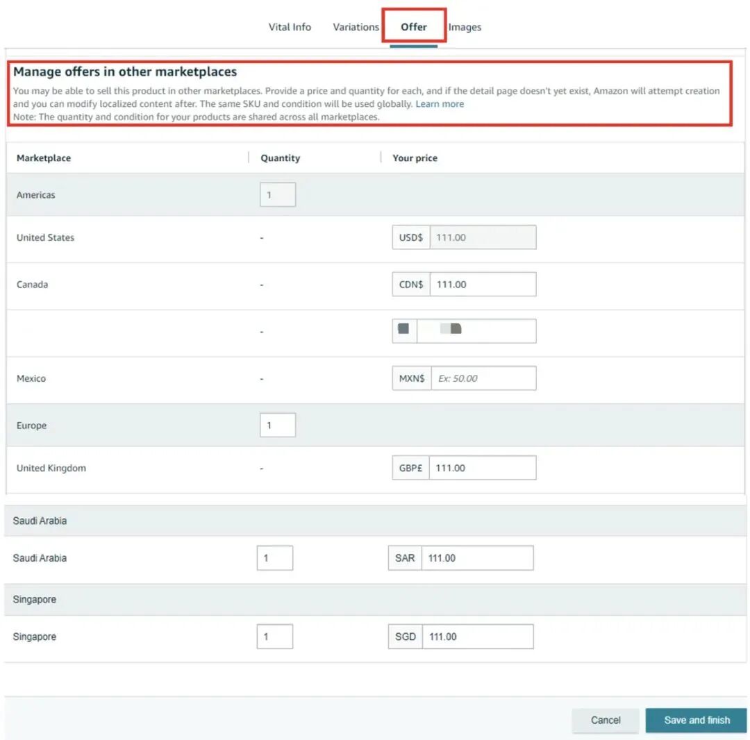 2.一键同步Listing至多个站点。到这一步,亚马逊将帮助卖家在全球多个站点销售此商品。在输入主要站点的商品信息后,卖家现在可以选择在其他站点也创建一个报价。卖家可以在不同站点输入不同的数量或价格。